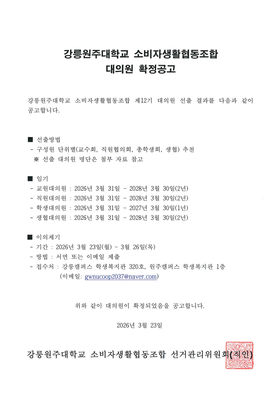 2026 강릉원주대학교 소비자생활협동조합 대의원 선출자 확정 공고